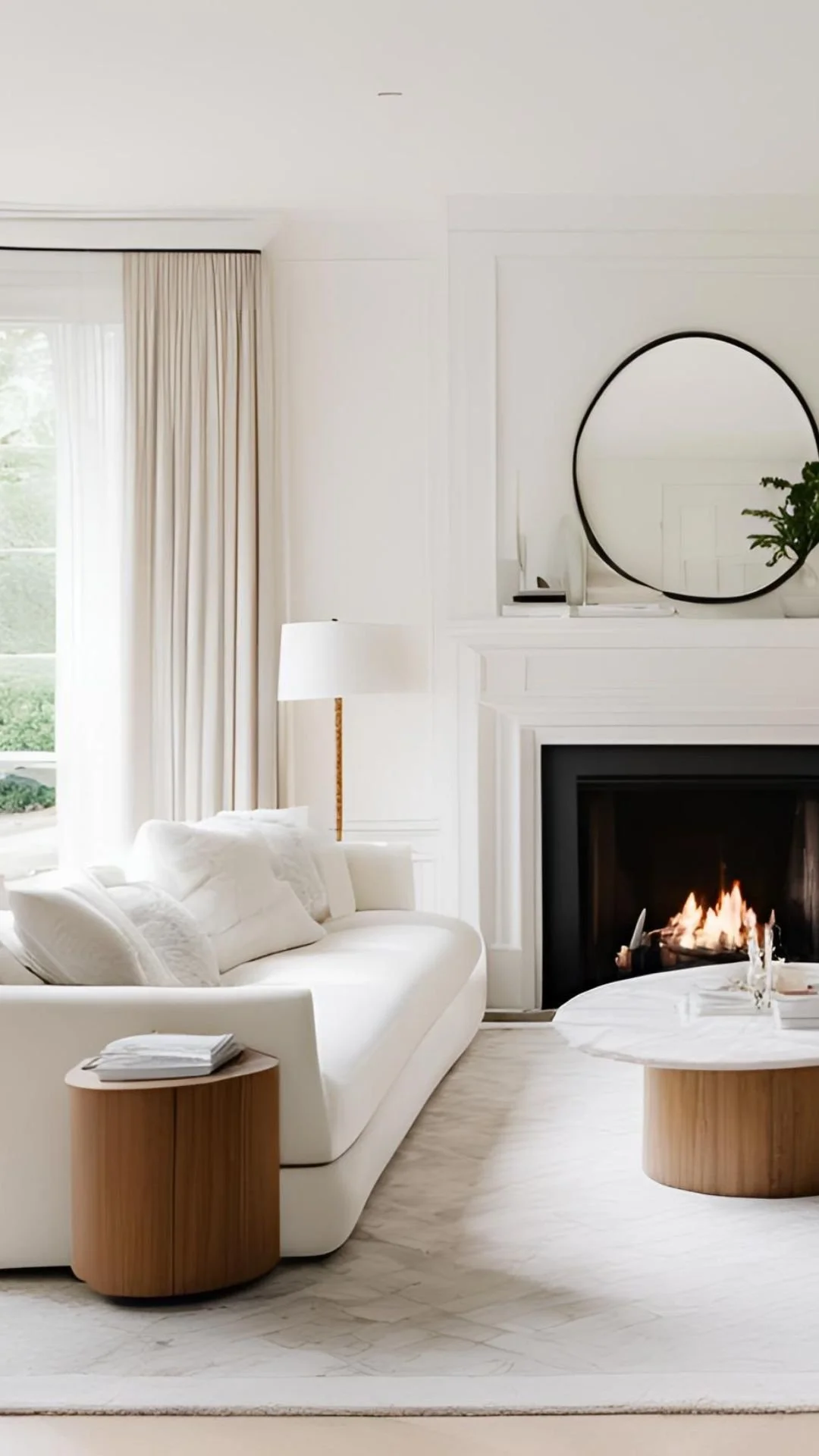 Modernes, helles Wohnzimmer mit weißem Sofa, rundem coffee table, Kamin, natürlichem Licht Interior Design Wien